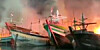 Tragisk video: Her går 13 kuttere op i flammer 13 skibe gik onsdag op i flammer i en stor brand ved havnen i Tegal City i Indonesien.
